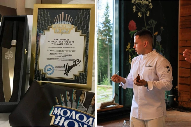 Слева сертификат победителя проекта «Молодые ножи» и награда — «Золотой нож», а справа — Григорий на одном из ужинов