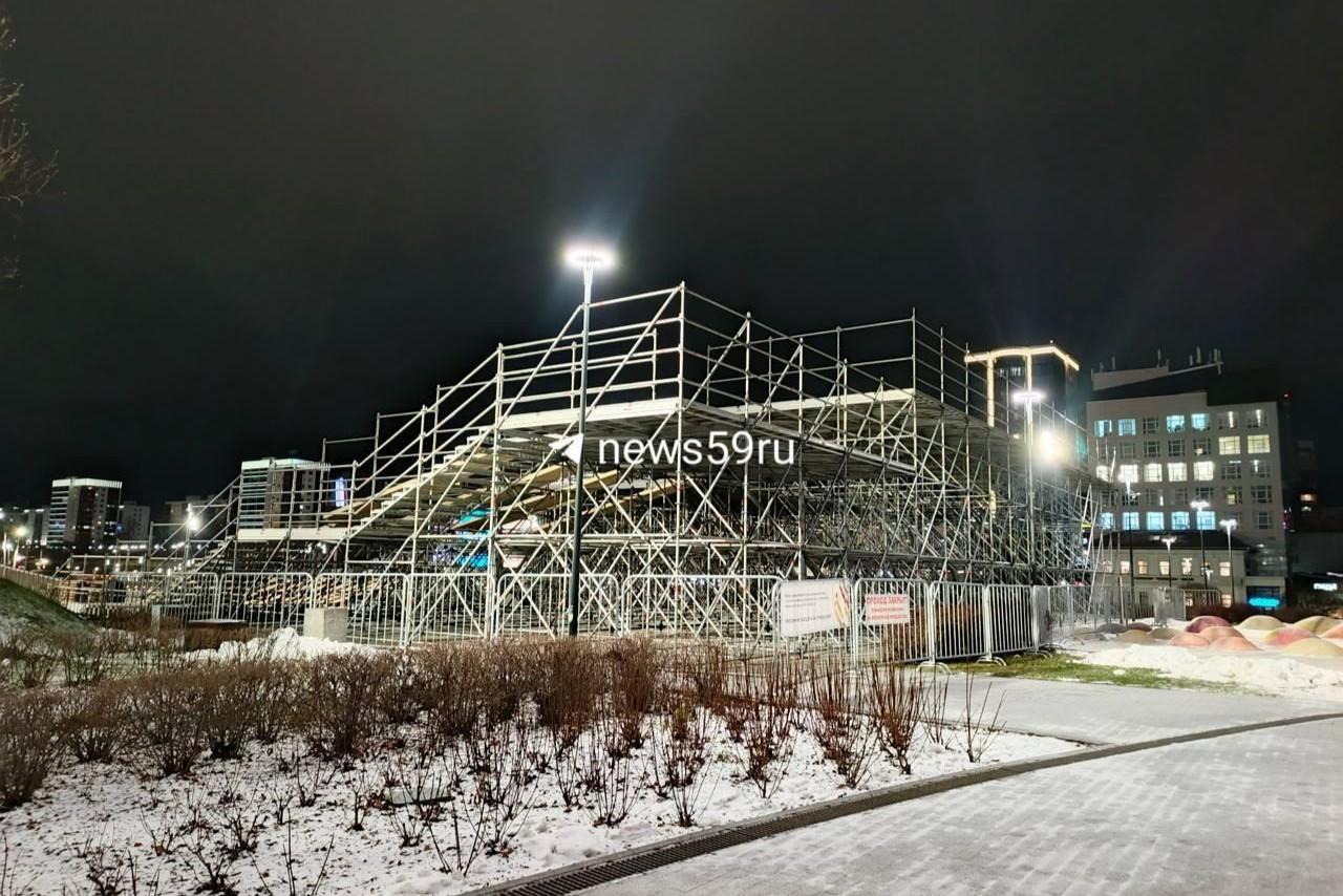На пермской эспланаде возвели каркас под гигантскую горку для сноуборда и ватрушекЗдесь развернутся события зимнего фестиваля