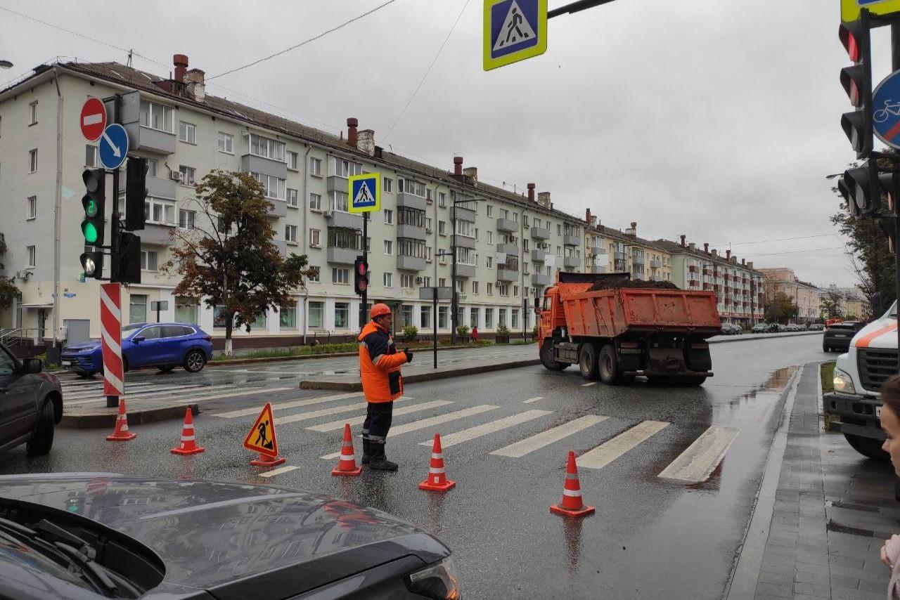 На улице Ленина из земли выдергивают столб, движение перекрыли — фотоМашины стоят от Крисанова до площади Гайдара