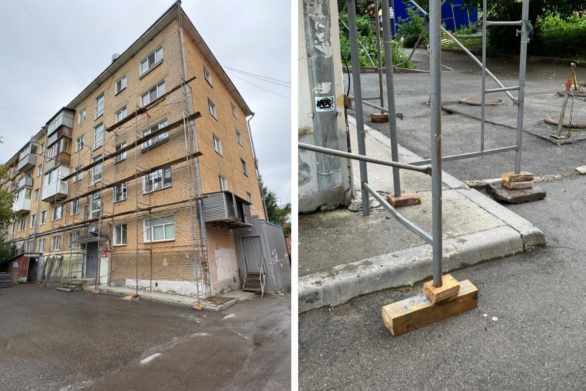 Строительные леса у пермского дома поставили на маленькие дощечки — фото чуда инженерной мыслиНа дощечках держатся огромные конструкции