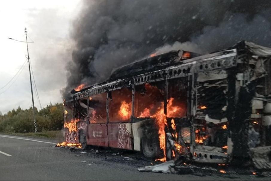 В загоревшемся под Красавинским мостом автобусе пострадали три человекаПожар начался после столкновения автобуса со столбом